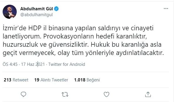 Gül paylaşımında, "İzmir'de HDP il binasına yapılan saldırıyı ve cinayeti lanetliyorum. Provokasyonların hedefi karanlıktır, huzursuzluk ve güvensizliktir. Hukuk bu karanlığa asla geçit vermeyecek, olay tüm yönleriyle aydınlatılacaktır" ifadelerini kullandı.