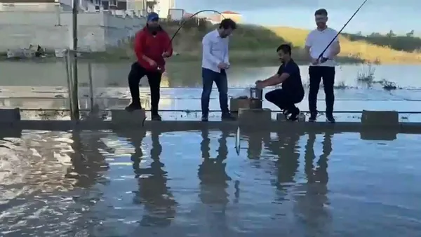 Göle dönen Çorlu sokakları nedeniyle gençler konuyu tiye alıp oltayla balık tutma mizansenini videoya çekti.