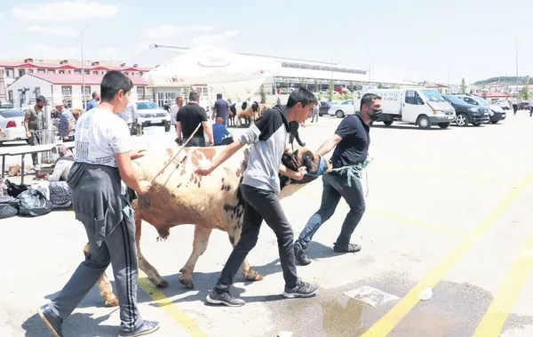 Kurbanlıklar, kesim yerlerine götürülürken, zorluk çıkardı. 200 kiloluk hayvanı, 4-5 kişi zor zaptetti.