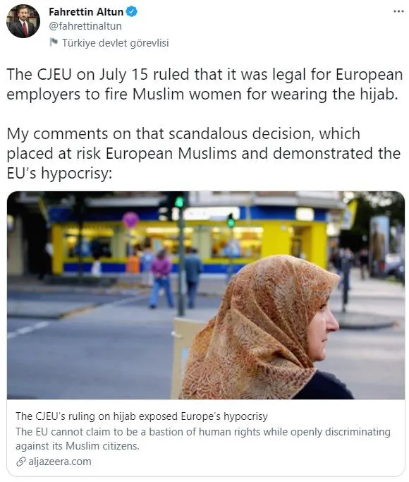 İletişim Başkanı Altun, AB Adalet Divanı'nın başörtüsü kararı hakkında AlJazeera için makale yazdı. Altun, Avrupa Birliği (AB) Adalet Divanı'nın başörtüsü kararının AB'nin iki yüzlülüğünü ortaya koyduğunu belirtti.