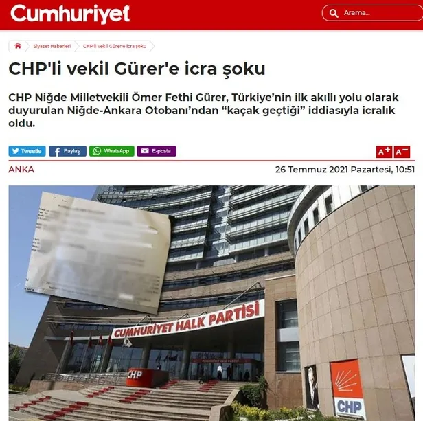 Cumhuriyet: CHP Niğde Milletvekili Ömer Fethi Gürer, Türkiye'nin ilk akıllı yolu olarak duyurulan Niğde-Ankara Otobanı'ndan "kaçak geçtiği" iddiasıyla icralık oldu.