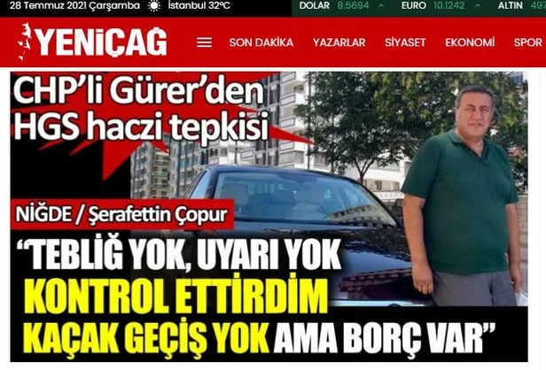 Yeniçağ: CHP Niğde Milletvekili Ömer Fethi Gürer, en pahalı otoyollardan olan Ankara Niğde Karayolu'nu 'kaçak' kullandığı gerekçesiyle hakkında haciz işlemi başlatıldığını söyledi. Gürer, "HGS olmasına rağmen kaçak geçiş gösterilmiş" dedi.