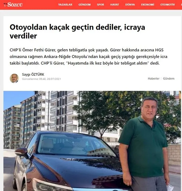 CHP Niğde Milletvekili Ömer Fethi Gürer, "geçiş garantili otoyol ücreti" nedeniyle haksız yere icralık olduğunu iddia etti, "Doğrudan bariyer açıldı, geçtim gittim" diyen Gürer, kaçak geçiş yaptığına dair kendisine bir bildiri ulaşmadığını hatta Karayolları'ndan ödeme kontrolü yaptığında kendisine 'Herhangi bir kaçak geçiş görünmediğini' bildirdiklerini belirtti. FOX, Sözcü, Cumhuriyet, TELE 1 gibi yandaş medya da peşine takılarak yalana çanak tuttu. CHP tayfasının yalanı görüntülerle ifşa oldu. Görüntülerde hem CHP'li Gürer'in bakiyesinin yetersiz olduğu için bariyerin açılmadığı hem de kendisine geçiş sırasında ödemeye ilişkin uyarı yapıldığı görüldü.