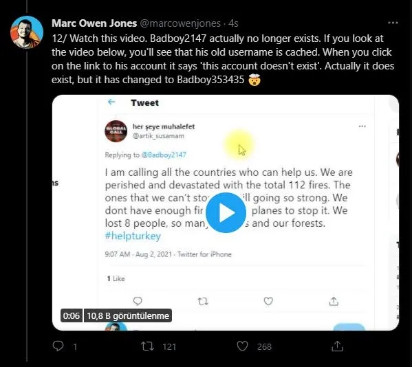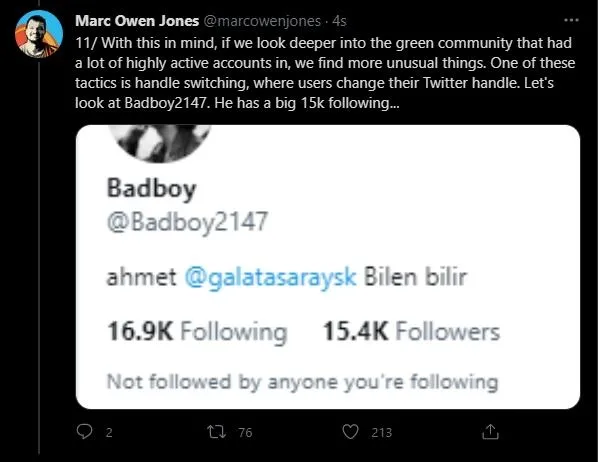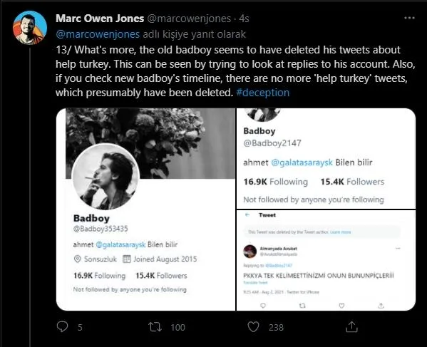 Daha sonra 15 bin takipçisi bulunan 'Badboy2147' adlı hesabı inceleyen Jones, aslında hesabın olmadığını videolu paylaşım ile gözler önüne serdi. Jones, bu taktiğin de Türkiye'de sıklıkla kullanıldığını aktardı.
