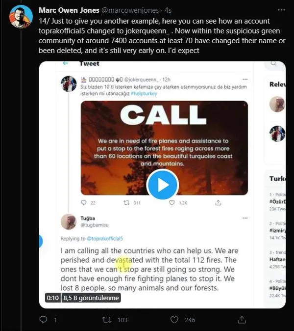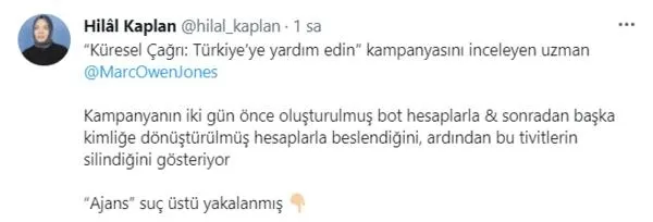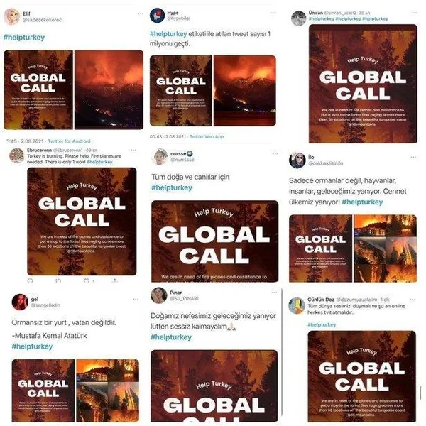 Türkiye başta Antalya olmak üzere birçok noktada çıkan yangınlarla etkili mücadelesini sürdürüyor. 140 yangın kontrol altına alınmışken yetkililerin güçlü ve etkili çalışmalarını baltalamak amacıyla bot hesaplar harekete geçti. 'Global Call Help Turkey' adıyla ülkemizi güçsüz ve aciz göstermek için çaba harcayan operasyon çocuklarının maskesi düştü. Akademisyen Marc Owen Jones yürüttüğü araştırmada kampanyanın kirli yüzünü anlattı. Konuya ilişkin paylaşımda bulunan Sabah Gazetesi yazarı Hilal Kaplan ise, "Kampanyanın iki gün önce oluşturulmuş bot hesaplarla, sonradan başka kimliğe dönüştürülmüş hesaplarla beslendiğini, ardından bu tivitlerin silindiğini gösteriyor “Ajans” suç üstü yakalanmış." dedi.