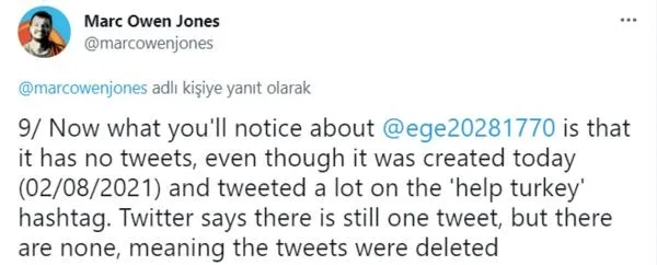 Fakat burada ilginç bir durum ortaya çıktı. Çünkü bu hesaptan sadece 1 paylaşım yapıldığı görüldü. Twitter'ın hala hesapta tweet bulunduğunu kabul ettiğini ifade eden Jones, "Ancak hiçbiri yok, yani tweetler silindi" dedi. EPFL araştırmasından da bahseden Jones, etiket altında paylaşım yaptıktan sonra tweetleri silme taktiğinin Türkiye'de sıklıkla kullanıldığını bildirdi.