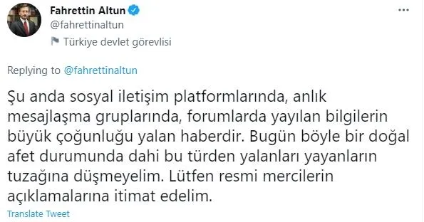 Sosyal medyada, mesaj gruplarında ve forumlarda yayılan bilgilerin pek çoğunun yalan olduğunu kaydeden Altun, "Bugün böyle bir doğal afet durumunda dahi bu türden yalanları yayanların tuzağına düşmeyelim. Lütfen resmi mercilerin açıklamalarına itimat edelim" dedi.