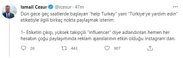 Cumhurbaşkanı Danışmanı İsmail Cesur, yardım çağrılarıyla ilgili 11 maddelik bir açıklama yaptı: