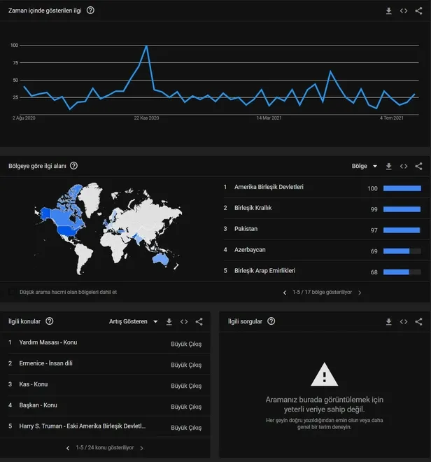 Türkiye'de bir süredir devam eden orman yangınlarıyla mücadele tüm hızıyla sürerken, sosyal medyada bot hesapların şişirdiği #HelpTurkey etiketi gündeme oturdu. Dün akşam saatlerinde başlatılan ve bir anda hızla büyüyen sözde yardım çağrısı, kronik muhalif isimlerin desteği ve FETÖ'cülerin de paylaşımıyla siyasi operasyon halini aldı. Etiketteki görsellerin kim tarafından hazırlanıp, servis edildiği merak konusu olurken, paylaşılan bilgilerin birçoğunun yalan olduğu ve siyasi operasyon amacı güttüğü ortaya çıktı. Paylaşımların yangını söndürme odaklı olmasından çok, Türkiye'ye siyasi bir müdahale gerektiği iması taşıması dikkat çekti. Dünya genelinde #HelpTurkey paylaşımlarının yoğunluğuna bakıldığında öncelikle Amerika Birleşik Devletleri görünüyor. Liste Birleşik Krallık, Pakistan, Azerbaycan ve Birleşik Arap Emirlikleri şeklinde devam ediyor.