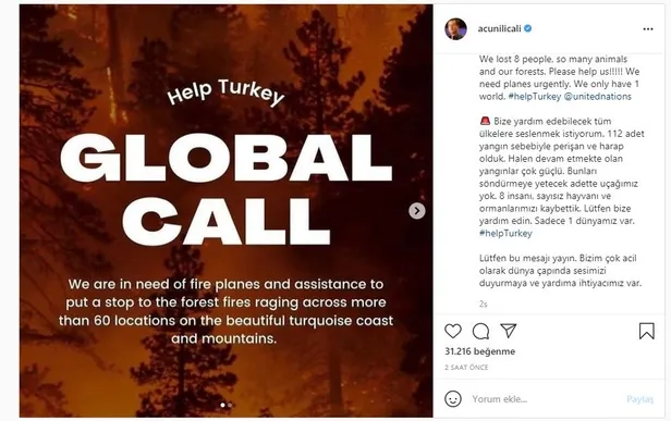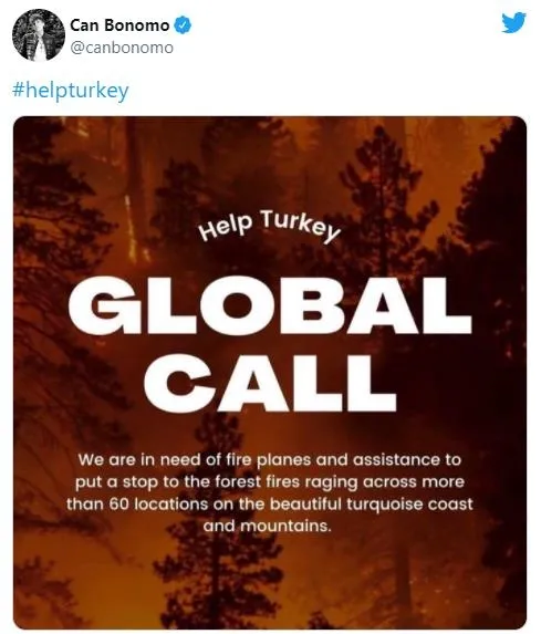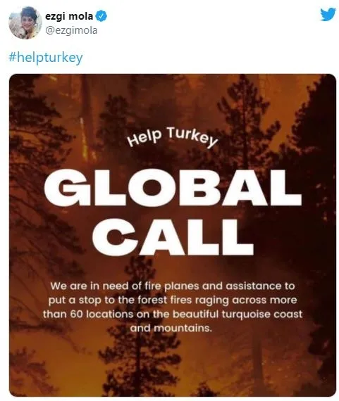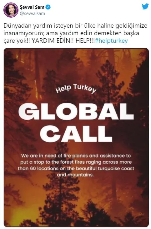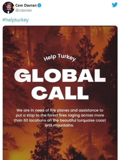 "Bize yardım edebilecek tüm ülkelere seslenmek istiyorum. 112 adet yangın sebebiyle perişan ve harap olduk. Halen devam etmekte olan yangınlar çok güçlü. Bunları söndürmeye yetecek adette uçağımız yok. 8 insanı, sayısız hayvanı ve ormanlarımızı kaybettik. Lütfen bize yardım edin. Sadece 1 dünyamız var. #helpTurkey