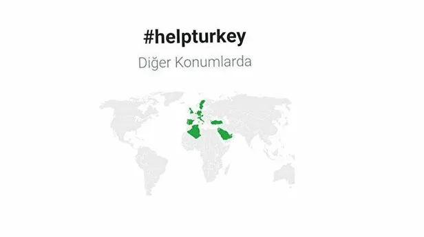 Dünya genelinde #HelpTurkey paylaşımlarının yoğunluğuna bakıldığında öncelikle Amerika Birleşik Devletleri görünüyor. Liste Birleşik Krallık, Pakistan, Azerbaycan ve Birleşik Arap Emirlikleri şeklinde devam ediyor.
