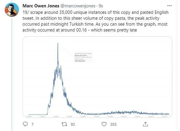 "Help Turkey" etiketi altında paylaşımlarda bu tür algı kampanyalarında görüldüğü gibi "kopyala-yapıştır" taktiğinin de kullanıldığını belirten Jones, binlerce hesabın İngilizce hazırlanmış bir Tweet'i etiket altında herhangi bir değişiklik ya da retweet yapmadan kopya bir şekilde paylaştığına işaret etti.