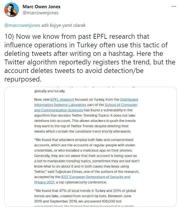 Jones, "Özetle, "#HelpTurkey kampanyası manipülasyon dolu. Gerçek kişiler ve ünlülerin sayıyı yükseltmesine ek olarak, yapay olarak