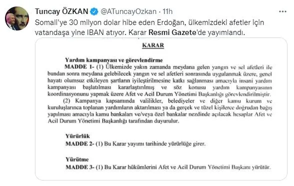 CHP Trabzon Milletvekili Ahmet Kaya: Resmi Gazete'de yayımlanan Cumhurbaşkanı kararı ile yangın ve sel afetzedeleri için yardım kampanyası başlatıldı. Vergi üstüne vergi koyan; kaynaklarımızı saraya, yandaşa, Suriyeliye, Somaliliye harcayan AKP, vatandaşa IBAN gönderiyor! Yeter artık T A M A M !