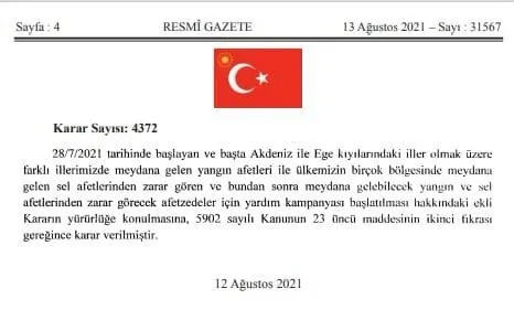 Resmi Gazetede yayımlanan karara göre, Türkiye'de yakın zamanda yaşanan yangın ve seller ile bundan sonra meydana gelecek benzeri afetler sonrasında uygulanmak üzere, genel hayatı olumsuz etkileyen şartların iyileştirilmesine katkı sağlaması amacıyla insani yardım kampanyası başlatılacak.
