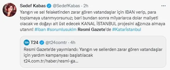 Sedef Kabaş: Yangın ve sel felaketinden zarar gören vatandaşlar için IBAN verip, para toplamaya utanmıyorsunuz; bari bundan sonra milyarlarca dolar maliyeti olacak ve doğayı alt üst edecek KANAL İSTANBUL projesini ağzınıza almaya utanın!