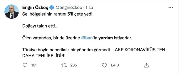 CHP Grup Başkanvekili Engin Özkoç: Sel bölgelerinin rantını 5'li çete yedi. Doğayı talan etti... Ölen vatandaş, bir de üzerine #iban'la yardım istiyorlar. Türkiye böyle beceriksiz bir yönetim görmedi... AKP KORONAVİRÜS'TEN DAHA TEHLİKELİDİR!