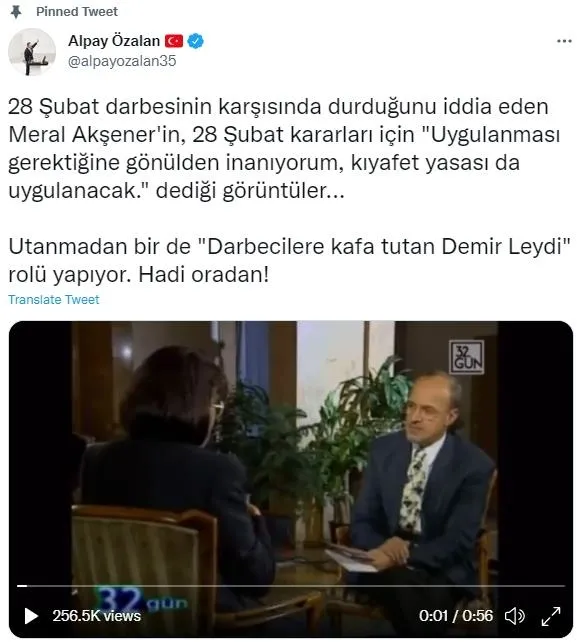 AK Parti İzmir Milletvekili Alpay Özalan, 32. Gün isimli programdan Akşener'in 28 Şubat kararlarıyla ilgili sorulara verdiği cevapların videosunu paylaşarak Akşener'e tepki gösterdi. Özalan, sosyal medya hesabından "28 Şubat darbesinin karşısında durduğunu iddia eden Meral Akşener'in, 28 Şubat kararları için 'Uygulanması gerektiğine gönülden inanıyorum, kıyafet yasası da uygulanacak' dediği görüntüler... Utanmadan bir de 'Darbecilere kafa tutan Demir Leydi' rolü yapıyor. Hadi oradan!" ifadelerini kullandı.