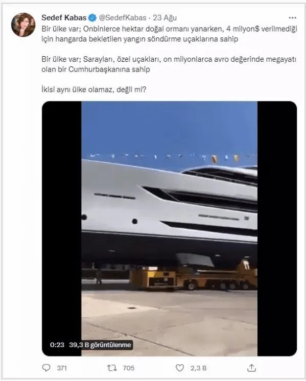 Antalya'da yabancı uyruklu bir kişi için üretilen bir yatın Başkan Erdoğan'a aitmiş gibi gösteren Kabaş, "Bir ülke var; Onbinlerce hektar doğal ormanı yanarken, 4 milyon$ verilmediği için hangarda bekletilen yangın söndürme uçaklarına sahip Bir ülke var; Sarayları, özel uçakları, on milyonlarca avro değerinde megayatı olan bir Cumhurbaşkanına sahip İkisi aynı ülke olamaz, değil mi?'' sözleriyle algı operasyonu başlattı. Sedef Kabaş'ın bu yalanı sosyal medyada hızla dolaşıma sokuldu.