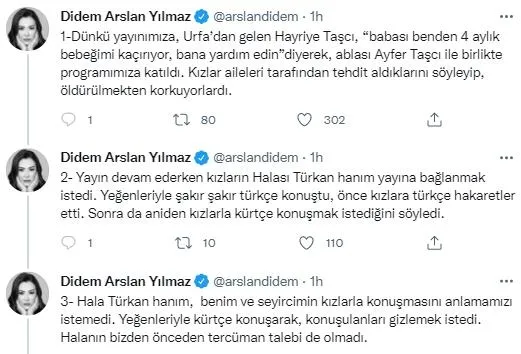 Yayından alınan kadının konuşulanları gizlemek istediğini bu yüzden Türkçe yerine Kürtçe konuşmak istediğini ifade eden Didem Arslan Yılmaz, kadını Kürt olduğu için değil küfrettiği için yayından aldığını söyledi.