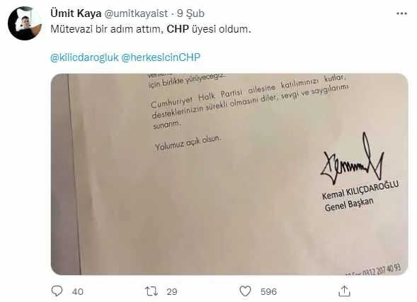 Ümit Kaya 9 Şubat 2021 tarihinde CHP'ye üye oldu.
