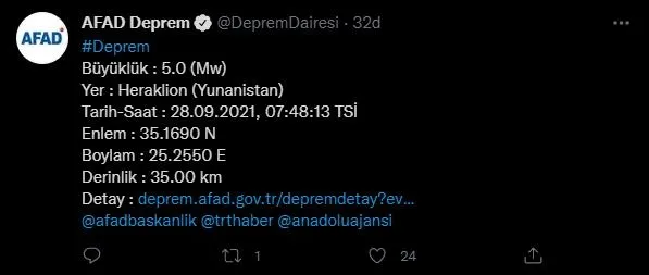 Afet ve Acil Durum Yönetimi Başkanlığının (AFAD) internet sitesinde yer alan bilgiye göre, Yunanistan'ın Girit Adası'nda saat 07.48'de 5 büyüklüğünde deprem meydana geldi.