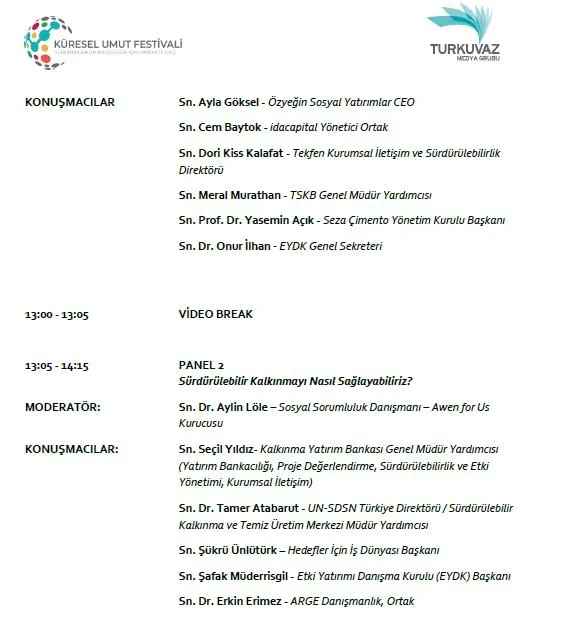 Turkuvaz Medya Grubu ve ekonomi dergisi InBusiness öncülüğünde sürdürülebilirlik konusunda farkındalık oluşturma misyonuyla başlatılan Küresel Umut Festivali kapsamında düzenlenen 'Sürdürülebilir Hikâyeler Webinar Serisi'nin sonuncusu 'Sürdürülebilir Kalkınma-Etki Yatırımı' başlığıyla 30 Eylül 2021 Perşembe günü gerçekleşecek.
