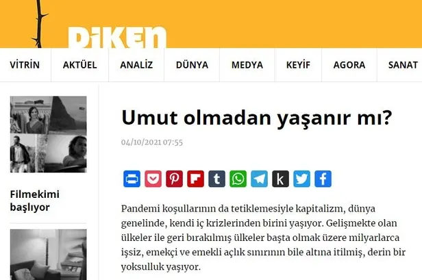 Haberin kaynağı CHP yandaşı Diken! Geçmişte de yaptığı PKK ve Demirtaş güzellemeleriyle bilinen Diken, "Umut olmadan yaşanır mı?" başlığıyla HDPKK'lı Demirtaş'ın yazısına yer verdi, PKK'nın sözcüsü oldu.