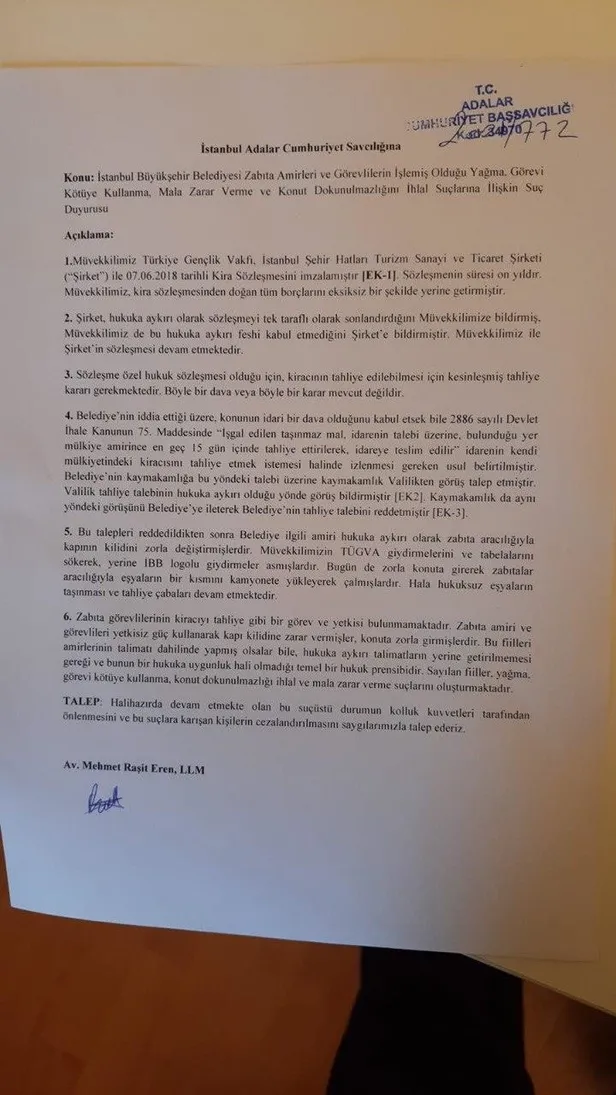 Türkiye Gençlik Vakfı'nın, Adalar Cumhuriyet Başsavcılığı'na suç duyurusunda bulunduğu öğrenildi. Suç duyurusunda; İstanbul Büyükşehir Belediyesi zabıta amirleri ve görevlilerin yağma, görevi kötüye kullanma, mala zarar verme ve konut dokunulmazlığını ihlal suçlarını işlediğine dikkat çekildi.