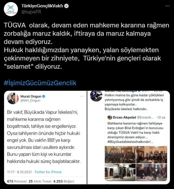 "Vakfımızca, hizmetlerimizi kamu yararı adına yürütmek amacıyla kullanılan TÜGVA Adalar İlçe Temsilciliği binası bugün (5 Ekim 2021) sabah saatlerinde hukuksuz bir tahliye teşebbüsüne uğramıştır. İlgili binanın kullanım hakkı İstanbul Şehir Hatları Turizm Sanayi ve Ticaret Anonim Şirketi ile 2018 senesinde 10 sene için imzaladığımız kira sözleşmesi uyarınca vakfımıza aittir. Mevzuattan ve kira sözleşmesinden kaynaklanan tüm yükümlülüklerimiz eksiksiz bir şekilde yerine getirilmiş, kira ücreti bir kere dahi geciktirilmeden düzenli olarak ödenmiştir. İstanbul Büyükşehir Belediyesi özel hukuka tabi sözleşmemizi haksız bir şekilde tek taraflı olarak feshettiğini beyan etmiş ve bu haksız feshin tarafımızca kabul edilmemesi akabinde kaymakamlıktan tahliyemizi talep etmiştir. Kira sözleşmemizin devam ettiğine ilişkin açtığımız tespit davası sürecinin devam etmesi ve konuya ilişkin verilmiş bir mahkeme kararı olmaması nedeniyle kaymakamlık ve valilik İBB'nin bu talebini reddetmiştir. İBB bu kararı tanımayarak, yetkisiz zabıta kuvvetlerinin kaba kuvvetini kullanarak eşyalarımızı, hangi eşyaların götürüldüğüne ilişkin herhangi bir kayıt dahi tutulmadan, zorla binamızdan gasp etmiş ve bina dışına çıkarmıştır.