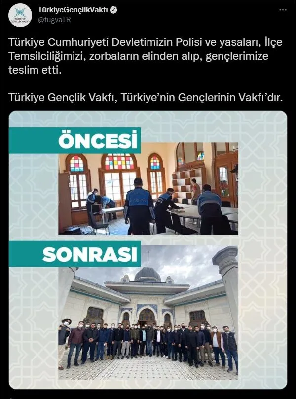 "Türkiye Gençlik Vakfı olarak İstanbul Adalar'da İBB'den tamamen hukuka uygun şekilde kiraladığımız ve günü gününe kiramızı ödediğimiz ilçe binamıza bugün CHP'li İBB Başkanı ve CHP'li Adalar Belediye Başkanı'nın emriyle zabıtalar baskın yapmıştır."