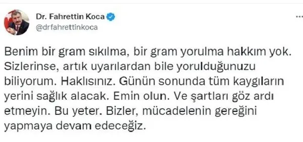 Sağlık Bakanı Fahrettin Koca, sosyal medya hesabından dikkat çeken bir açıklama yaptı. Koca, "Benim bir gram sıkılma, bir gram yorulma hakkım yok. Sizlerinse, artık uyarılardan bile yorulduğunuzu biliyorum. Haklısınız. Günün sonunda tüm kaygıların yerini sağlık alacak. Emin olun. Ve şartları göz ardı etmeyin. Bu yeter. Bizler, mücadelenin gereğini yapmaya devam edeceğiz." dedi.