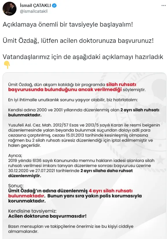 İYİ Parti’den ayrılarak kendi partisi olan Zafer Partisi’ni kuran Ümit Özdağ, dün katıldığı bir televizyon programında silah ruhsatı istediğini ancak İçişleri Bakanlığı’nın vermediğini iddia etti. Ümit Özdağ’ın iddialarına İçişleri Bakan Yardımcısı İsmail Çataklı, “Ümit Özdağ, lütfen acilen doktorunuza başvurunuz” sözleriyle paylaştığı açıklamada Özdağ’ın 4 ayrı silah ruhsatının olduğunu ifade etti.
