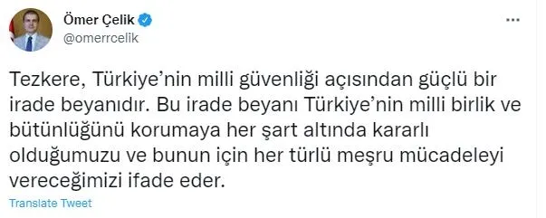 AK Parti Sözcüsü Ömer Çelik ise tezkere meselesine ilişkin "Tezkere, Türkiye'nin milli güvenliği açısından güçlü bir irade beyanıdır. Bu irade beyanı Türkiye'nin milli birlik ve bütünlüğünü korumaya her şart altında kararlı olduğumuzu ve bunun için her türlü meşru mücadeleyi vereceğimizi ifade eder." dedi.