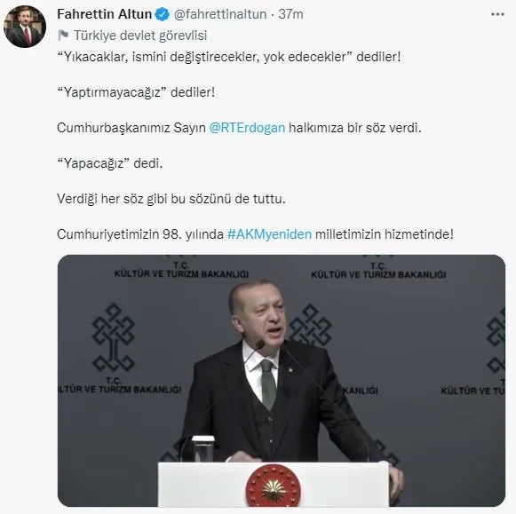 Cumhurbaşkanlığı İletişim Başkanı Fahrettin Altun, sosyal medya hesabından dikkat çeken AKM paylaşımı yaptı. Altun, "Yıkacaklar, ismini değiştirecekler, yok edecekler, dediler. 'Yaptırmayacağız' dediler. Cumhurbaşkanımız Sayın Recep Tayyip Erdoğan halkımıza bir söz verdi, 'yapacağız' dedi. Verdiği her söz gibi bu sözünü de tuttu. Cumhuriyetimizin 98. yılında AKM yeniden milletimizin hizmetinde." ifadesini kullandı.