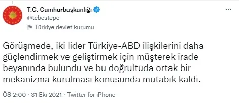 Başkan Erdoğan'ın ABD Başkanı Biden ile görüşmesinde iki ülke ilişkilerini güçlendirmek ve geliştirmek için ortak mekanizma kurulması konusunda mutabık kalındığı bildirildi.
