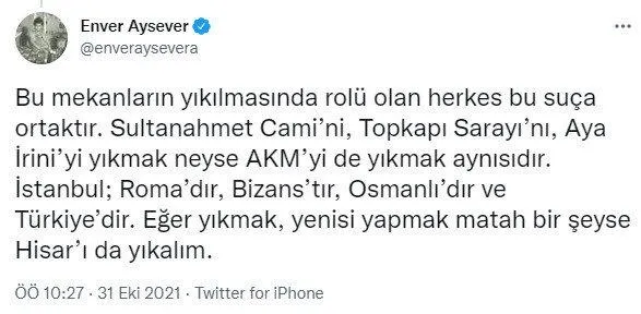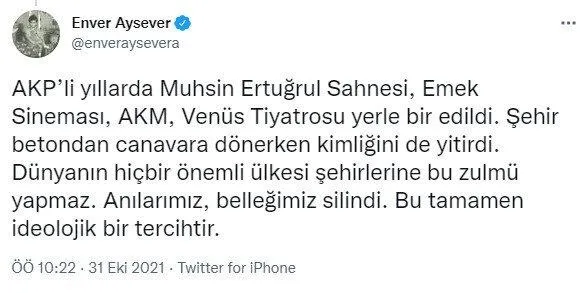 Gazeteci Enver Aysever, eski AKM'nin yıkılmasıyla İstanbul'a zulmedildiğini savundu. Aysever, "Dünyanın hiçbir önemli ülkesi şehirlerine bu zulmü yapmaz. Anılarımız, belleğimiz silindi. Bu tamamen ideolojik bir tercihtir" dedi.