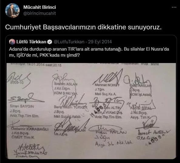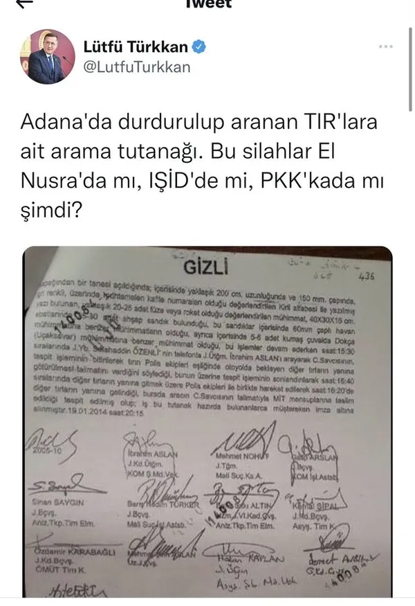 Tüm bu bilgi ve belgelere rağmen sosyal medya hesabı üzerinden tetikçilik yapan Türkkan'ın, "Adana'da durdurulup aranan TIR'lara ait arama tutanağı. Bu silahlar El Nusra'da mı, IŞİD'de mı, PKK'da mı şimdi?" diyerek provokasyona soyunduğu görüldü.