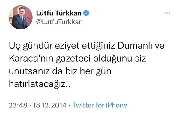 Türkkan'ın FETÖ'nün medya tetikçileri Dumanlı ve Karaca'yla ilgili tweetleri de dikkat çekti.