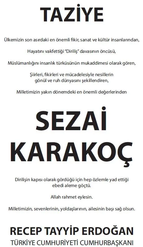 "Ülkemizin son asırdaki en önemli fikir, sanat ve kültür insanlarından, hayatını vakfettiği 'Diriliş' davasının öncüsü, Müslümanlığını insanlık türküsünün mukaddimesi olarak gören, şiirleri, fikirleri ve mücadelesiyle nesillerin gönül ve ruh dünyasını şekillendiren, milletimizin yakın dönemdeki en önemli değerlerinden Sezai Karakoç, Dirilişin kapısı olarak gördüğü için hep özlemle yad ettiği ebedi aleme göçtü. Allah rahmet eylesin. Milletimizin, sevenlerinin, yoldaşlarının, ailesinin başı sağ olsun."