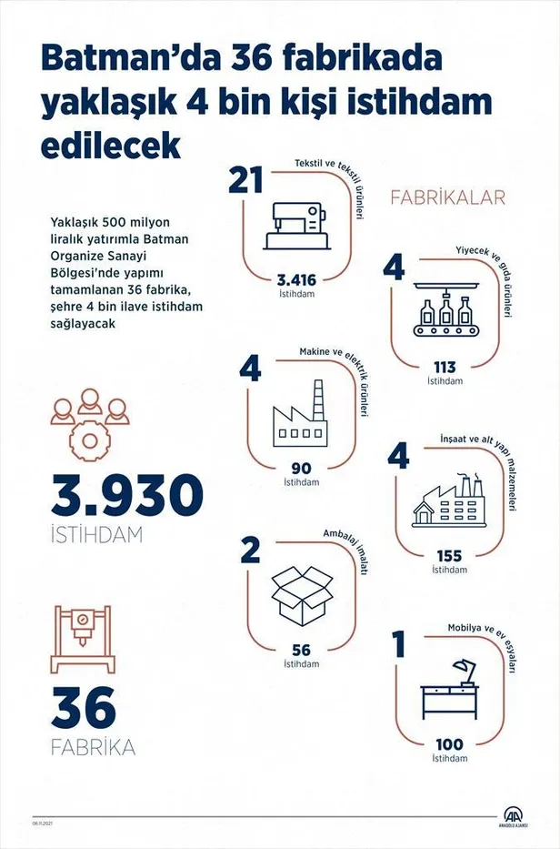 Başkan Recep Tayyip Erdoğan'ın Batman ziyaretinde açtığı 36 fabrika/tesis tıkır tıkır işlemeye başladı. 507 milyon 376 bin liralık yatırım sermayesiyle kurulan ve faaliyete geçen tesisler, 4 bin işçiye ekmek kapısı oldu. Bazı tekstil fabrikaları günde 3 vardiya usulü 24 saat çalışacak kapasiteye ulaşmış durumda. Batman ve ülke ekonomisine büyük katkı sunacak fabrikalardan sadece bir tanesinin yıllık ciro hedefi 20 milyon dolar.