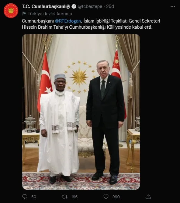 Cumhurbaşkanlığı'ndan yapılan açıklamada, "Cumhurbaşkanı Recep Tayyip Erdoğan, İslam İşbirliği Teşkilatı Genel Sekreteri Hissein Brahim Taha'yı Cumhurbaşkanlığı Külliyesinde kabul etti." ifadelerine yer verildi.