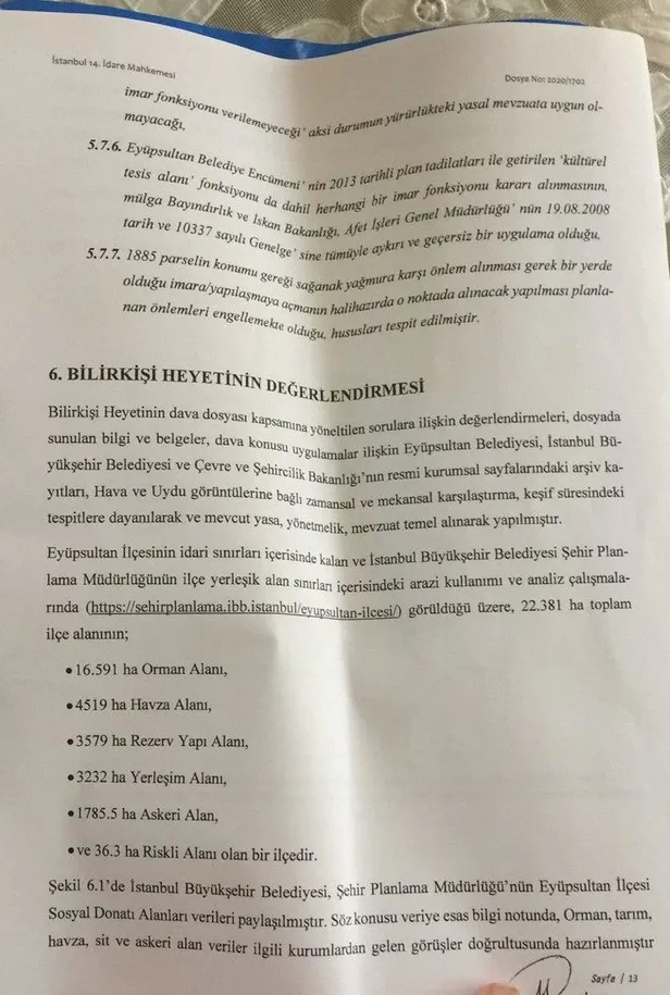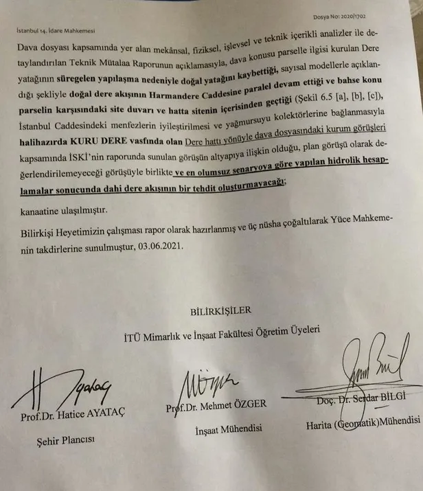 Sabah'ın haberine göre konunun yargıya taşındığını, mahkemenin konuyu incelemek için bilirkişi tayin ettiğini aktaran Mimar Osmanlıoğlu, "İstanbul Teknik Üniversite'sinden gelen bilirkişi heyeti yaptıkları incelemede herhangi bir tehlike olmadığını, bölgenin dere yatağı olmadığı raporlayıp caminin yapılmasına engel teşkil edecek unsurların olmadığını belirterek olumlu görüş bildirdi.