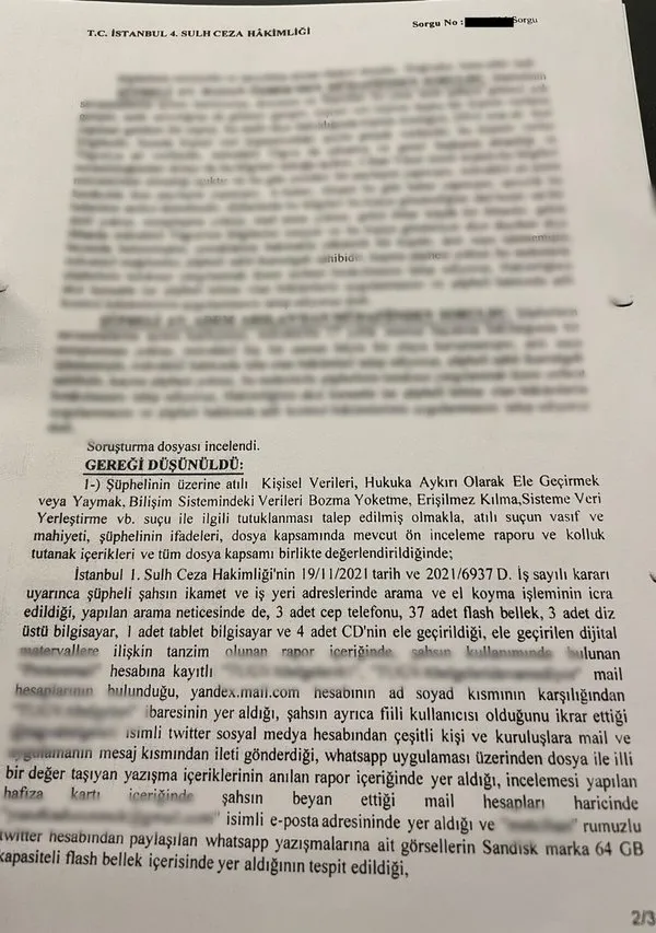 Soruşturma kapsamında Ramazan Aydoğdu'nun 3 adet cep telefonu, 2 adet harddisk, 37 adet flash bellek, 3 adet diz üstü bilgisayar, 1 adet tablet bilgisayar ve 4 adet CD'nin incelenmesine devam ediliyor. İstanbul Emniyet Müdürlüğü Terörle Mücadele Müdürlüğü, savcının talimatıyla harekete geçtiği ve 23 Kasım 2021 tarihinde söz konusu cep telefonunu internet bağlantısı olmadan ve sim kart takılmadan incelemeye başladığı öğrenildi. Ramazan Aydoğdu'nun, Başsavcılıkça ifadesinin alınmasının ardından, "verileri hukuka aykırı olarak verme veya ele geçirme" ve "sistemi engelleme, bozma, verileri yok etme, değiştirme" suçlarından tutuklanması talebiyle nöbetçi İstanbul Sulh Ceza Hâkimliği'ne sevk edilmişti. Nöbetçi hâkimlik, şüphelinin bu suçlardan tutuklanmasına hükmetmişti.