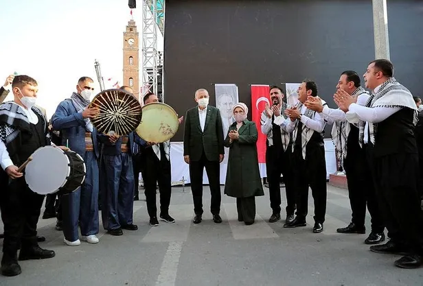 Başkan Erdoğan, alana gelişinde eşi Emine Erdoğan ile vatandaşları selamladı. Emine Erdoğan, konuşması boyunca Başkan Erdoğan'a kürsüde eşlik etti.