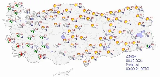 KUVVETLİ YAĞIŞ UYARISI: Yağışların Marmara'nın batısı, Kıyı ve Güney Ege ile Antalya ve Burdur çevrelerinde kuvvetli, Güney Ege kıyılarında çok kuvvetli, Muğla çevreleri ile Aydın'ın kıyı kesimlerinde yer yer şiddetli ve aşırı olması beklendiğinden sel, su baskını, yıldırım, yağış anında kuvvetli rüzgar, ulaşımda aksamalar gibi olumsuzluklara karşı dikkatli ve tedbirli olunması gerekmektedir.
