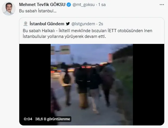 Esenler Belediye Başkanı ve İBB AK Parti Grup Başkanvekili Mehmet Tevfik Göksu, sosyal medya hesabından yaptığı paylaşımda, "Bu sabah İstanbul..." ifadelerini kullandı.
