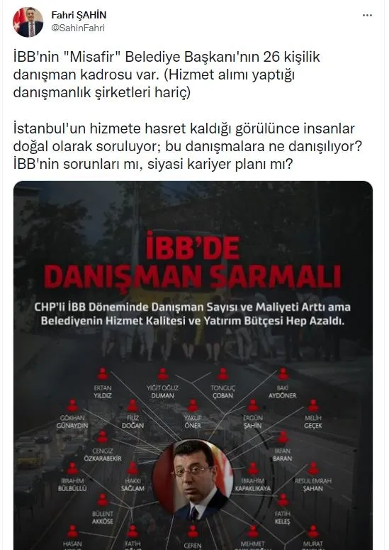 Şahin, "İBB'nin 'Misafir' Belediye Başkanı'nın 26 kişilik danışman kadrosu var. (Hizmet alımı yaptığı danışmanlık şirketleri hariç) İstanbul'un hizmete hasret kaldığı görülünce insanlar doğal olarak soruluyor; bu danışmalara ne danışılıyor? İBB'nin sorunları mı, siyasi kariyer planı mı? İstanbul bunu haketmiyor!" ifadelerini kullandı.