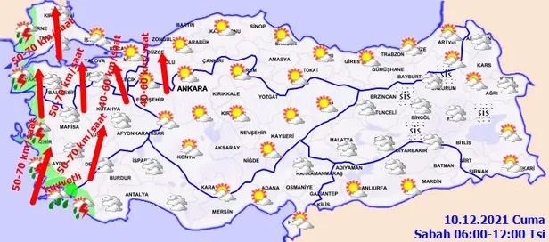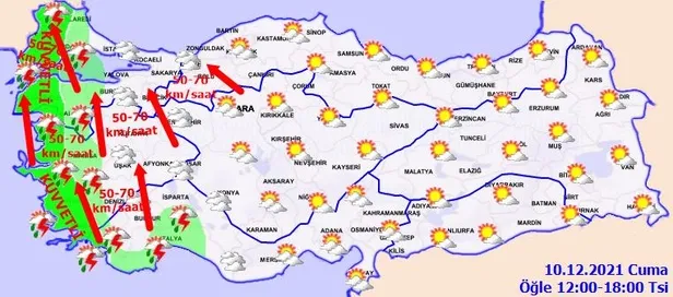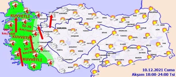 Ege Bölgesi'nde 10.12.2021 Cuma günü beklenen sağanak ve gök gürültülü sağanak yağışların genellikle yerel kuvvetli, Çanakkale, İzmir, Aydın, Muğla, Manisa çevreleri ile Balıkesir'in güneyinde kuvvetli ve çok kuvvetli (30-75 kg/m2), Muğla'nın kıyı ilçelerinde şiddetli (51-100 kg/m2), yer yer aşırı (100 kg/m2 üzeri) olması bekleniyor. Sel, su baskını, yıldırım, yerel dolu yağışı, hortum, kuvvetli rüzgar ve fırtına ile ulaşımda aksamalar gibi olumsuzluklara karşı dikkatli ve tedbirli olunması gerekmektedir.