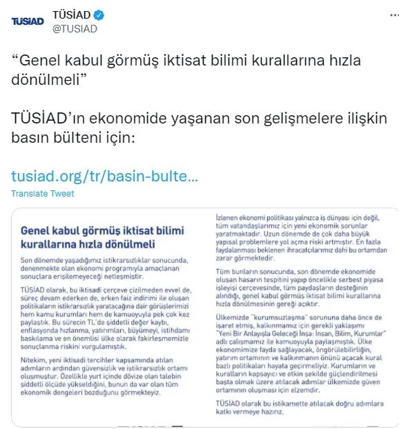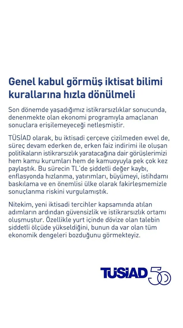 "Son dönemde yaşadığımız istikrarsızlıklar sonucunda, denenmekte olan ekonomi programıyla amaçlanan sonuçlara erişilemeyeceği netleşmiştir. TÜSİAD olarak, bu iktisadi çerçeve çizilmeden evvel de, süreç devam ederken de, erken faiz indirimi ile oluşan politikaların istikrarsızlık yaratacağına dair görüşlerimizi hem kamu kurumları hem de kamuoyuyla pek çok kez paylaştık. Bu sürecin TL'de şiddetli değer kaybı, enflasyonda hızlanma, yatırımları, büyümeyi, istihdamı baskılama ve en önemlisi ülke olarak fakirleşmemizle sonuçlanma riskini vurgulamıştık. Nitekim, yeni iktisadi tercihler kapsamında atılan adımların ardından güvensizlik ve istikrarsızlık ortamı oluşmuştur. Özellikle yurt içinde dövize olan talebin şiddetli ölçüde yükseldiğini, bunun da var olan tüm ekonomik dengeleri bozduğunu görmekteyiz"